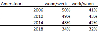 In 2006 werkte 50% van alle werknemers die in Amersfoort woonden, ook daadwerkelijk in hun eigen stad (zie kolom woon/werk). Dit aandeel is in 2018 gedaald naar 34%. Dus: werkte eerst grofweg de helft in de eigen stad, in 2018 was dat nog maar één op de drie.
